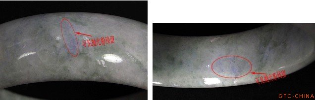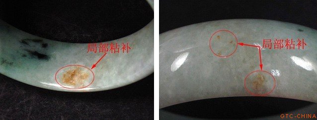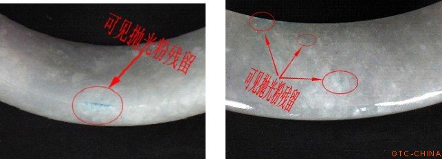 另外对于翡翠的处理方法中,现在在检测中经常见到的一种形式是利用抛光粉,给样品增色的一种方法。这种方法以绿色和紫色的抛光粉增色为主,是一般在无色的翡翠饰品表面或裂隙中留下绿色或紫色的抛光粉或者绿色的蜡,使饰品整体或局部呈现出对应的颜色;也有些本身是浅色的,为了突出本身的颜色而留下抛光粉的,这种一般称为色上加色。还有些翡翠饰品中,为了去掉表面的某一小点的瑕疵而在表面留下了一个针眼或稍大的小坑,然后为了美观和表面平整通常还会填补一些其他的物质上去。这些现象一般在手镯饰品中相对常见一些。像诸如此类的这些方法是否算是优化或处理方法是值得讨论的。