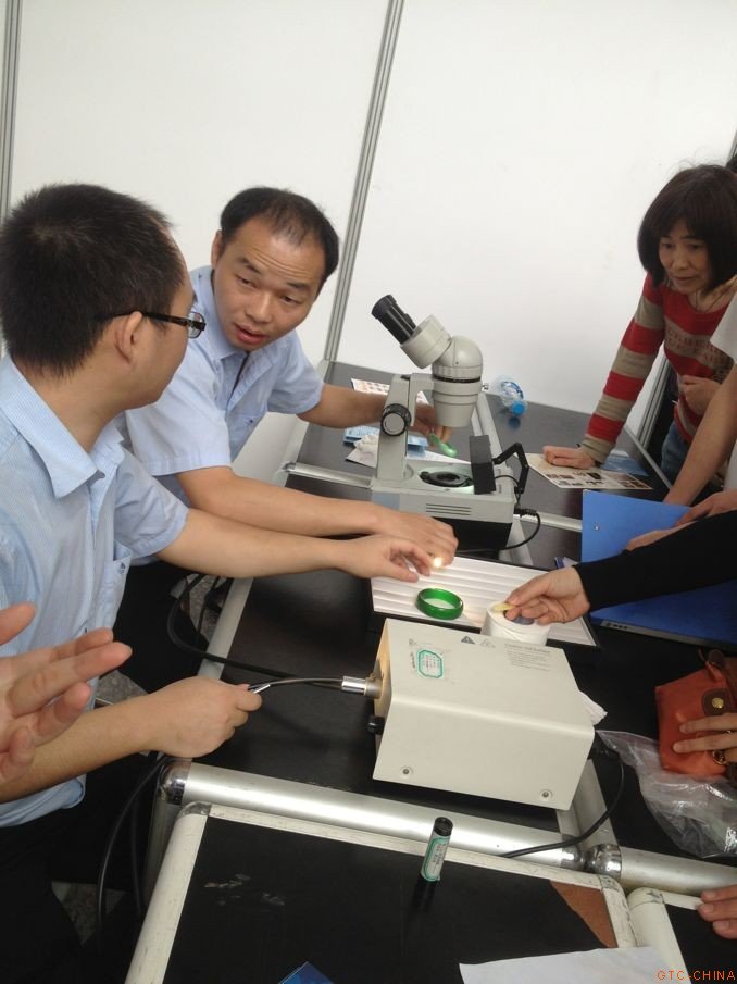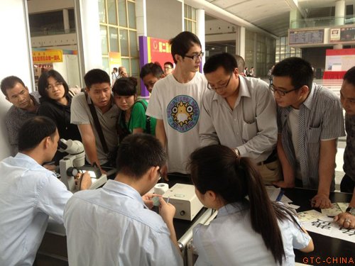 中国GTC东莞办事处受展会主办方特邀,派出了由白俊、赵君君、詹雨星组成的检测队伍,带着先进的珠宝检测仪器,到展会现场为广大珠宝爱好者进行免费检测,并提供相关珠宝知识咨询。