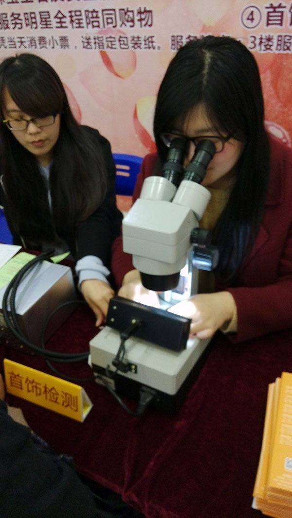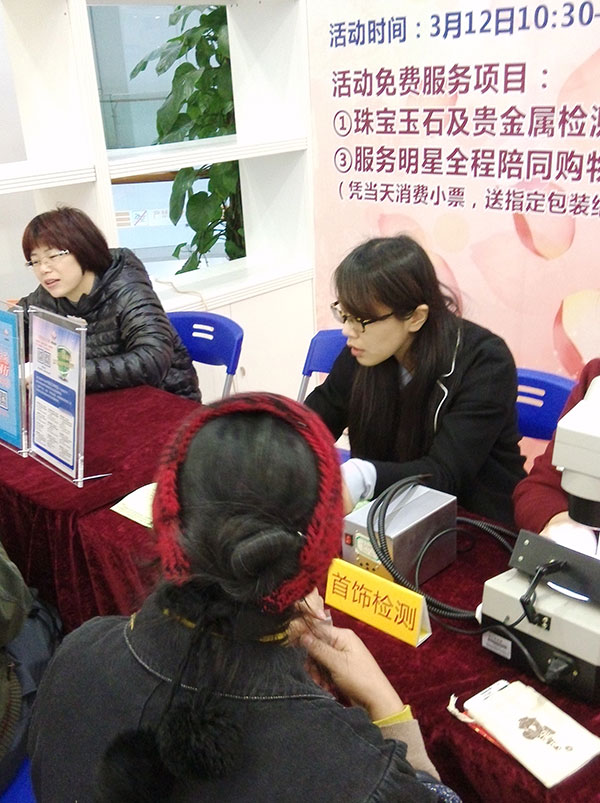 此次免费检测活动总部实验室受邀参加的人员有:检测师王怡梦,助理检测师孟明骐,助理检测师刘雪婧。活动于早上10点准时开始,我们的宣传挂画刚张贴出来就吸引了不少消费者前来咨询,当得知可以免费检测之后,便不断有消费者拿出自己购买的珠宝前来检测。在现场广百员工的组织下,人们自觉的排队检测,现场气氛变得热烈而有序起来。检测师王怡梦在应对消费者一件接一件样品的同时,还能用简洁明了的话语将检测结果告知消费者,让消费者对自己的“宝贝”有一个正确的认识。