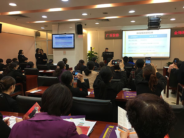 普天之下,质量至上,产品质量是每一个企业的生命线。伴随着“3.15”质量月如火如荼的开展,近日,广东经济科教频道对民众反映天河城商场“金戒指戴一天就变色一事”采访了GTC珠宝检测中心的熊燕主任。2016年3月17日,熊燕主任又受邀来到广百百货为从业者和消费者上了一场别开生面的《珠宝标准与标识》课程。本次开展的课程是针对性很强的培训课程,介绍2016年5月4日即将实施的GB 11887中关于贵金属及合金饰品纯度的规定及命名方法,贵金属首饰中镍、砷、汞等有害金属含量的规定,以及珠宝标识的规定。这对于商家和消费者正确认识和规范珠宝玉石市场起到了专业的引导作用。